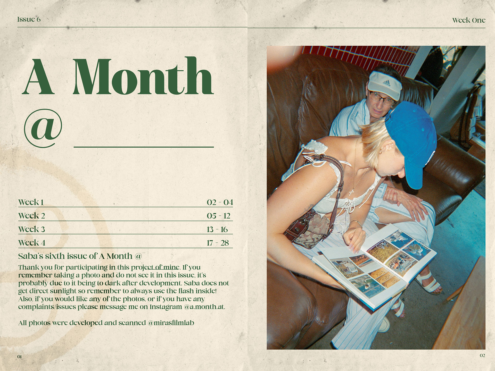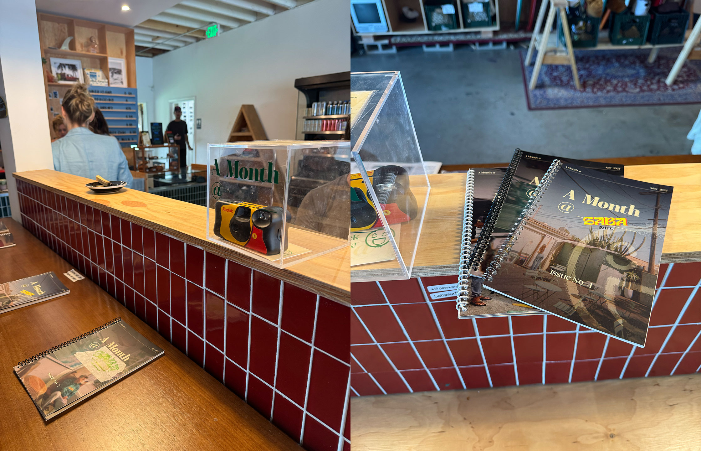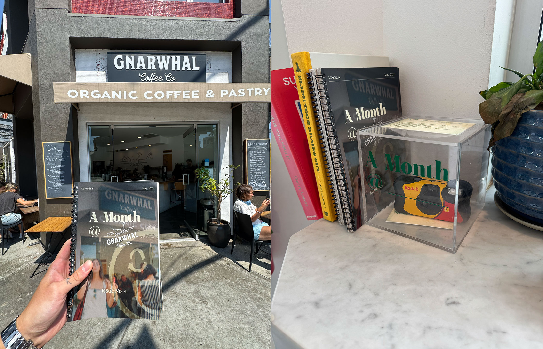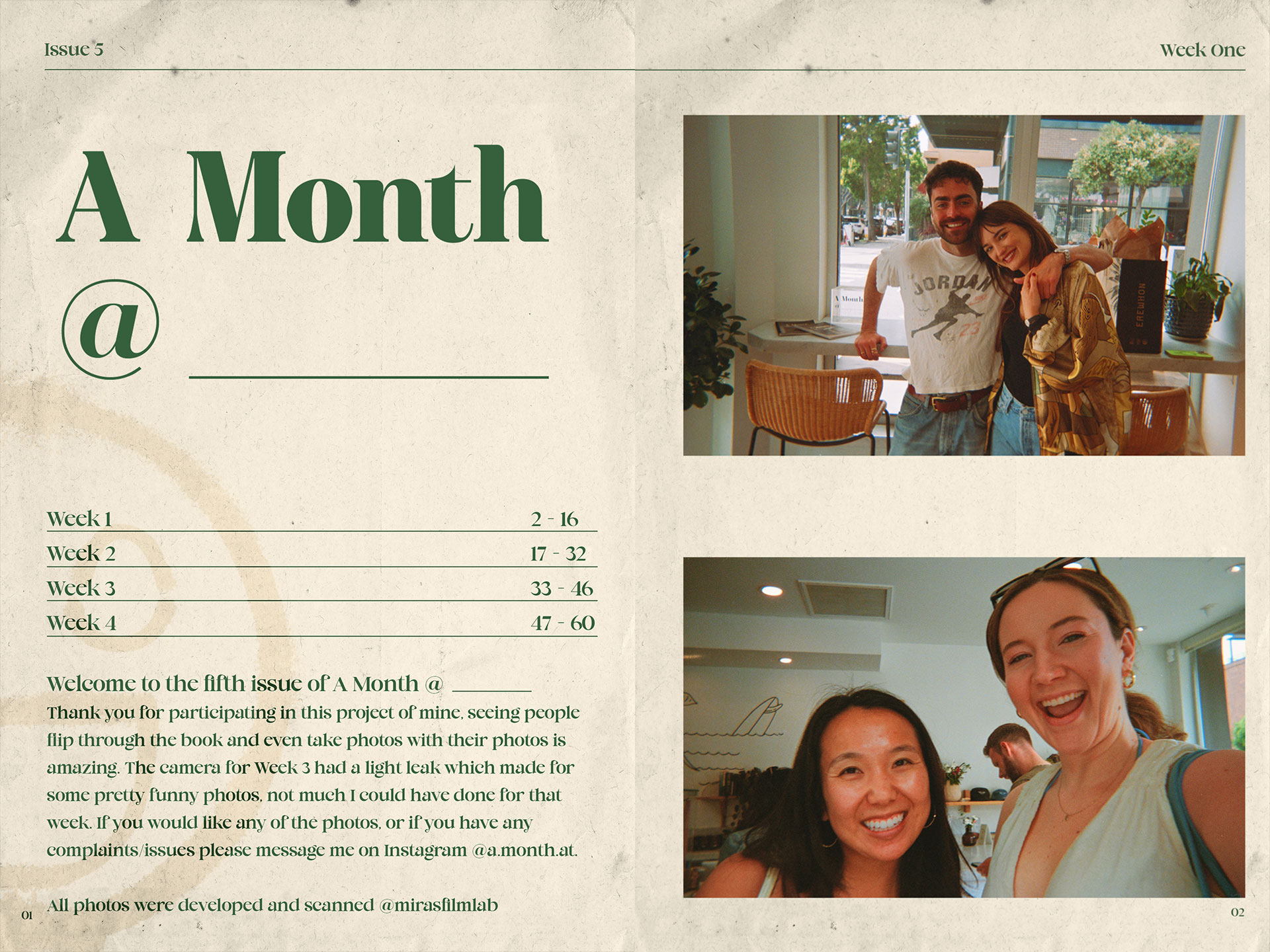 A Month @ is a creative project I founded that blends photography, community, and print design. Each installation places a disposable camera inside a local coffee shop, inviting patrons to capture authentic moments of everyday life. I then develop, scan, and curate the photos into a zine, paired with custom design layouts and social media content for the establishment. The project combines my skills in graphic design, photography, branding, and storytelling turning community-sourced images into both a physical art piece and a marketing tool.